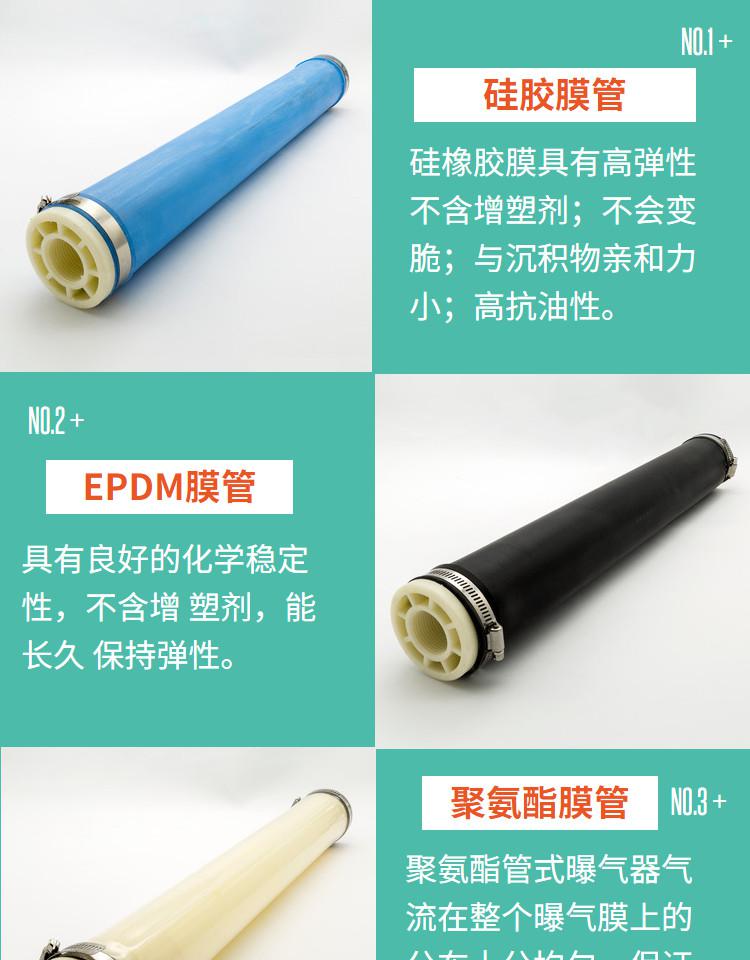 1.曝氣膜管采用三元乙丙橡膠(EPDM)材料,具有耐熱、耐臭氧、耐酸堿、化學(xué)穩(wěn)定性好等特點(diǎn),與一般橡膠膜相比,可大大提高其使用壽命。