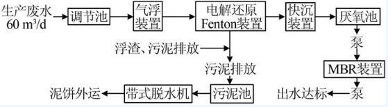 將原有調(diào)節(jié)池與缺氧池合并為新的調(diào)節(jié)池,在新調(diào)節(jié)池內(nèi)設(shè)置鼓風(fēng)曝氣系統(tǒng),在充分調(diào)節(jié)水質(zhì)水量的同時(shí),保證油類及懸浮物等污染物不會(huì)上浮;出水經(jīng)地上泵提升至氣浮裝置,在氣浮裝置內(nèi)進(jìn)行部分加壓溶氣氣浮預(yù)處理,去除廢水中大部分油類污染物、大量懸浮物SS等,以減少后續(xù)電解還原Fenton電極板清洗頻次,并降低后續(xù)處理負(fù)荷。氣浮裝置出水自流進(jìn)入電解還原Fenton裝置,通過(guò)外加電場(chǎng)作用該廢水,由于該廢水中含Cl-質(zhì)量濃度高、導(dǎo)電性良好,外加電場(chǎng)后,聯(lián)合化學(xué)藥劑共同作用,化學(xué)反應(yīng)劇烈,可對(duì)廢水中大分子有機(jī)污染物進(jìn)行氧化分解;電解還原Fenton裝置出水自流進(jìn)入快沉裝置,通過(guò)調(diào)節(jié)pH使大量污泥沉淀;快沉裝置上清液自流進(jìn)入?yún)捬醭?,通過(guò)厭氧微生物的新陳代謝作用去除廢水中難降解的有機(jī)污染物;厭氧池出水經(jīng)地上泵提升至MBR裝置,通過(guò)好氧微生物的作用進(jìn)一步降解廢水中的有機(jī)污染物,同時(shí)利用MBR膜組件的截留功能維持MBR裝置內(nèi)較高的污泥濃度,以增強(qiáng)系統(tǒng)的耐沖擊負(fù)荷能力;MBR裝置出水經(jīng)出水泵抽至出水桶,達(dá)標(biāo)后納管排放。
