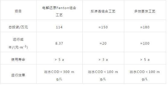 由表3可知,盡管反滲透與多效蒸發(fā)工藝處理出水COD更低,但投資、運(yùn)行成本均高于電解還原Fenton組合工藝,經(jīng)實(shí)踐證明采用電解還原Fenton組合工藝是經(jīng)濟(jì)合理的。