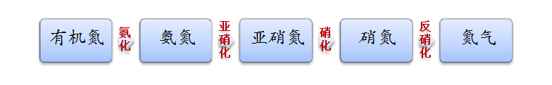 第二,利用微生物硝化和反硝化去除廢水中的氨氮,其原理是硝化菌和反硝化菌的聯(lián)合作用,將水中氨氮轉(zhuǎn)化為氮?dú)庖赃_(dá)到脫氮目的。首先通過硝化細(xì)菌和亞硝化細(xì)菌將氨氮轉(zhuǎn)化為亞硝酸鹽和硝酸鹽,然后再進(jìn)行反硝化,將硝酸鹽轉(zhuǎn)化為氮?dú)?。其反?yīng)原理圖如下所示: